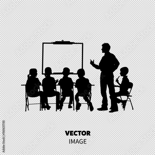 Black and white silhouette of a teacher explaining to students in a classroom. Perfect for educational themes, classroom discussions, and teaching scenarios highlighting student participation.