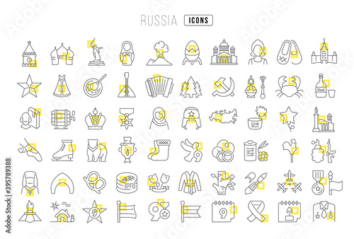 Country Russia, travel cartoon icons in set collection for design. Attractions and features vector symbol stock web illustration.