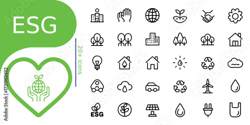 Collection of ecological and environmentally conscious line art icons with clean design
