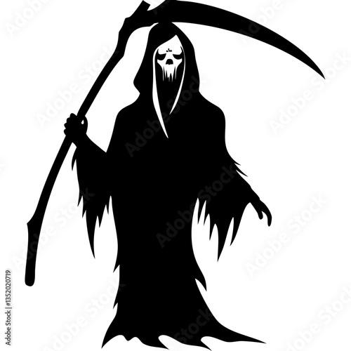 Grim reaper with a skull face holding a scythe in a black robe, symbol of death, halloween concept, spooky character, dark fantasy art, vector illustration, isolated on white background