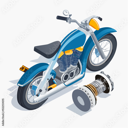 A detailed illustration of a blue cruiser motorcycle with chrome accents and a powerful engine.
