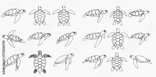 A collection of black and white line art illustrations depicting sea turtles from multiple perspectives on a transparent background.