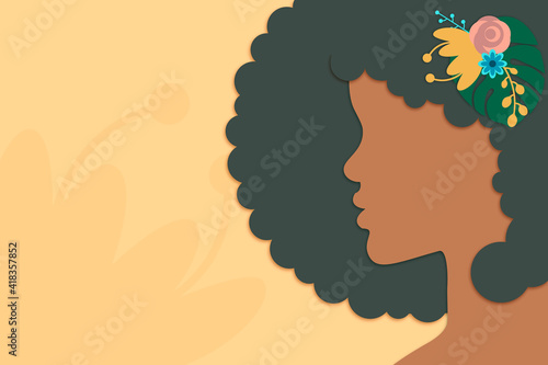 Side view of beautiful black girl with flowers in curly hair