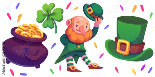 Saint Patrick day celebration set - cheerful leprechaun character, dark pot filled with golden coins, emerald shamrock leaf, green top hat with buckle, colorful confetti. Holiday greeting elements.