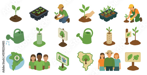 Reforestation Icon Set. Isometric vector illustration set of reforestation and habitat icons: tree sapling, watering can, shovel,