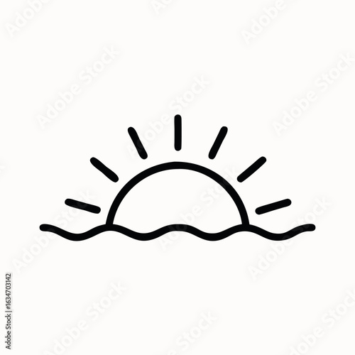 Illustration of a rising sun with rays emanating from the top and horizontal lines below the sun shape