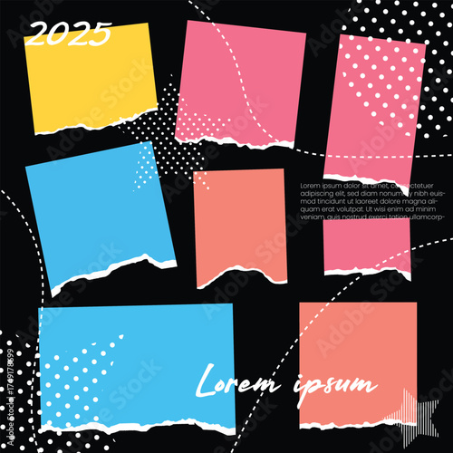 Modern torn paper composition. Trendy paper collage in vibrant color with drawn texure. Sticky notes, shreds of notebook pages. Vector . Various colorful shapes, geometric figures.