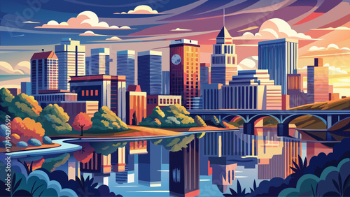 Very beautiful skyline of Richmond, Virginia, USA, featuring modern high-rise buildings, the James River, city bridges, and warm natural light creating a realistic vibrant urban landscape.