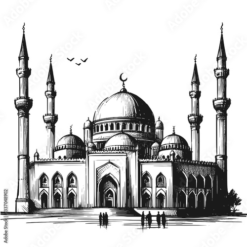 Vector of a traditional mosque building with domes and minarets, isolated on white background, minimalist outline and colored illustration