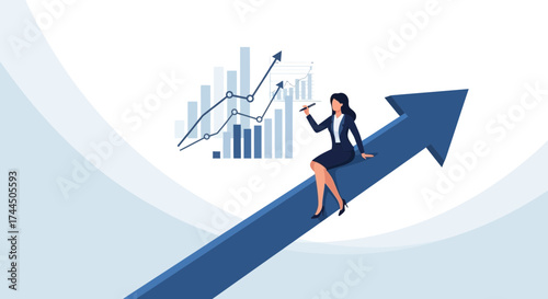 Businesswoman riding a rising arrow with financial graphs showing positive results and growth