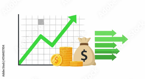 Illustration showing a rising green graph with coins and a money bag indicating financial growth