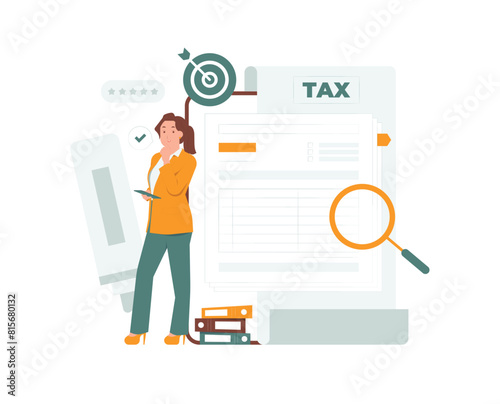 Vector illustration of tax document with financial report and bank building