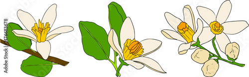 Vector illustrations of bergamot fruit lifecycle: flowers, green fruit, and sliced ripe fruit. Perfect for botanical designs, food packaging, or wellness branding. Clean lines, vibrant colors, and nat