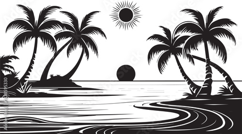 Sunset Beach Vector Art with Palm Trees, Coastal Silhouette, Tropical Scene, Seaside Relaxation, Black and White Design, Elegant, Exotic, Graphic Illustration, Island Paradise, Beautiful Seascape, Nat