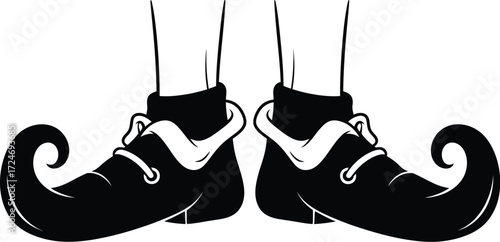 Black outline drawing of a whimsical elf shoe with a curled toe and a folded cuff.