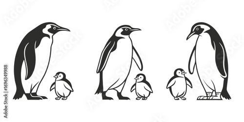 A gentle penguin mother lovingly embraces her small chick with wings.
