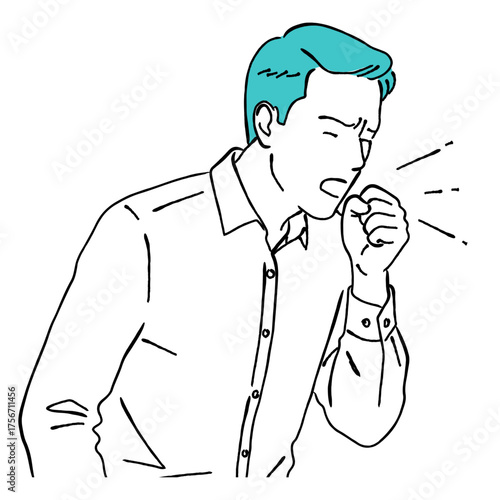 Unwell man coughing into his hand with discomfort in his chest, an illustration depicting symptoms of illness, flu, or allergy.