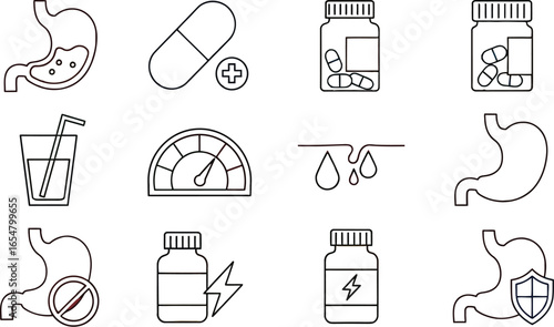 Set of collection line icons related stoamach, digestion, flatulence, healthy. Editable stroke. Perfect pixel on transparent background