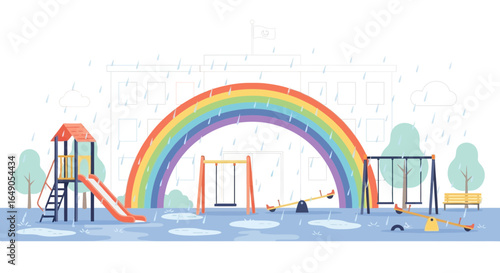 Sun behind rainy clouds, overcast cloudy sky and downpour. Weather change. Landscape background, nature scenery with heavy rain, storm and sunlight rays after rainclouds. Flat vector illustration