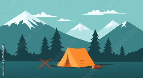 Flat vector illustration of a serene summer landscape. A calm lake reflects the pine forest and blue cloudy sky. Green grassy shore in the foreground. Suitable for background
