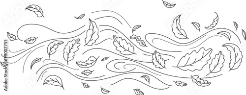Outline drawing of a breath of wind with flying autumn leaves.Wind blow set in line style.Wave flowing illustration with hand drawn doodle cartoon style.
