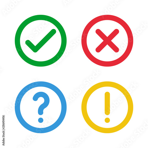 green check, red cross, blue question mark, yellow exclamation point, round thin line vector signs