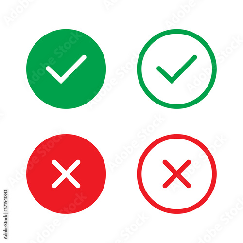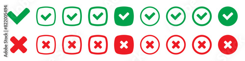 Right or wrong icons. Green tick and red cross checkmarks. Yes or no symbol, approved or rejected icon for user interface. Tick, cross signs. checkmark OK red X