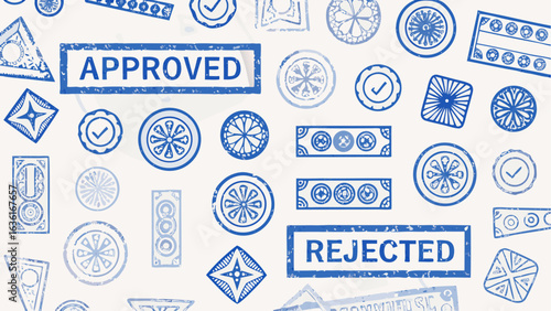Illustration showing a variety of blue stamp designs including approved rejected and geometric shapes allover