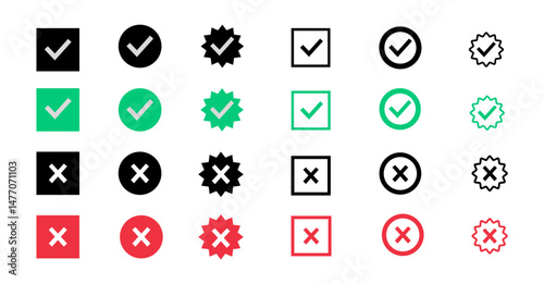 Check mark icon button set. Check box icon with right and wrong buttons and yes or no checkmark icons. Isolated checkmark symbol, right and wrong sign concept.  Yes or no symbol, approved or rejected