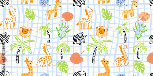 Seamless jungle tropical abstract pattern with palm tree, leaves. Summer texture. Vector illustration.