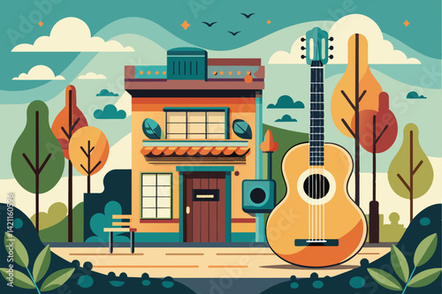 Country cottage house on a hill with path and tree, rustic homestead illustration conveying warmth, comfort and rural charm