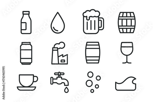 Brewery Equipment and Ingredients Icons Set: Crafting Process Illustrations for Beverage Production, Distilling, and Brewing Industry - Beer Making, Alcohol Production Graphics in Modern Design for Pr