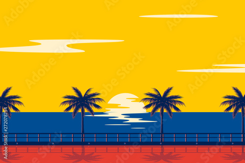 Tropical beach scene with palm trees and lounge chairs at sunset, flat colorful style