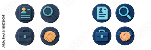 Volumetric icon set for job search and human resources featuring resume, search, briefcase, and handshake symbols for business applications