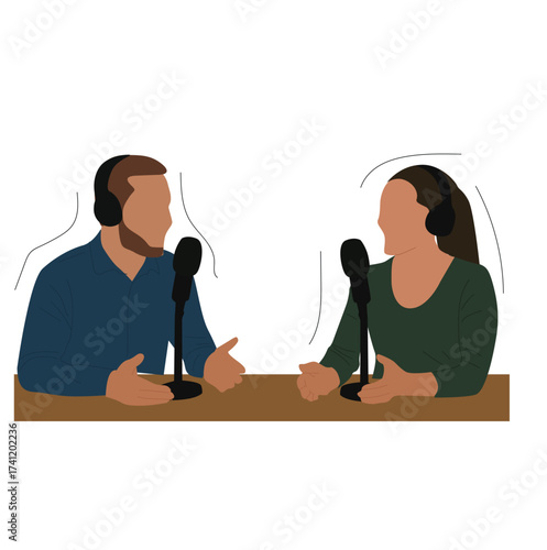 Vector art of podcast recording with microphone, phones, and people