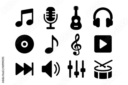 Music icon set: silhouette style of instruments, notes, and media controls