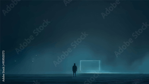 Lone figure standing in front of a glowing structure at night
