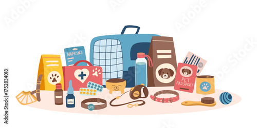 Essential accessories and supplies assortment for dogs and cats including toys and carriers