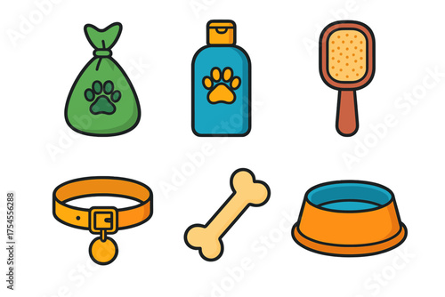 Essential pet care items for dogs and grooming supplies. Set of 6 vector illustration