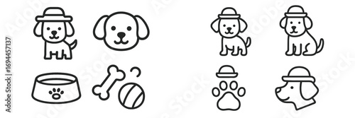 Black outline icons of simple dog accessories including a bone, ball, whistle, collar, and leash in a minimal linear design.