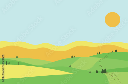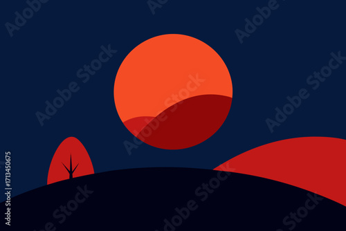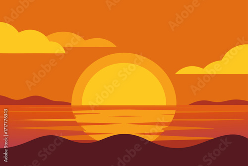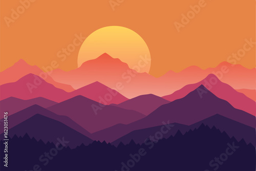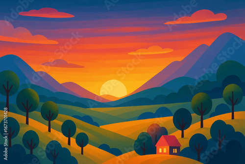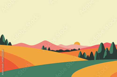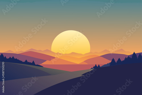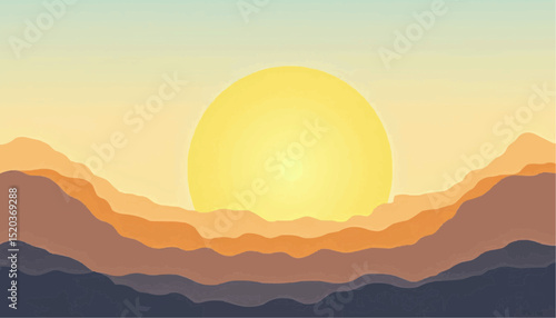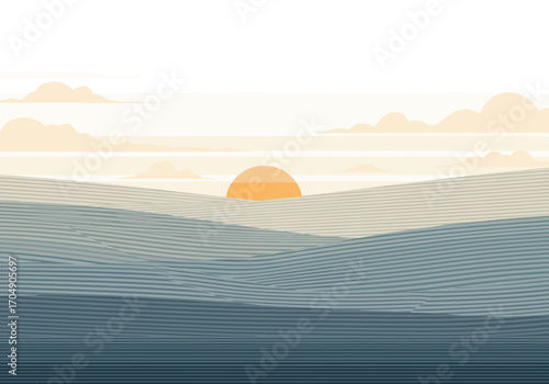 Abstract minimalist sunset landscape with layered hills and sun