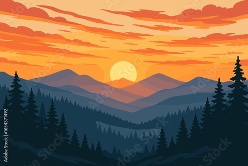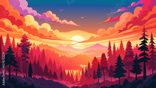vibrant mountain and forest landscape at sunrise with silhouetted pine trees on layered hills under a warm glowing sky with birds flying towards the rising sun vector illustration