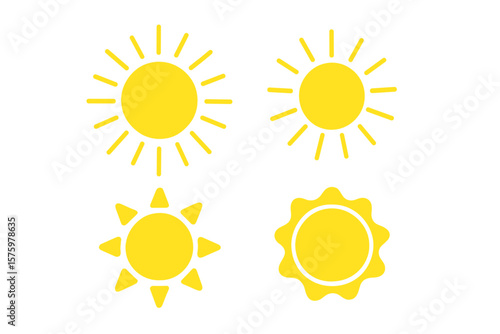 Set of 4 yellow sun icons. Summer sunshine weather symbol collection. Sunrise or sunset graphic element. Solar heat, sunlight ray, and sky burst concept. Vector illustration.