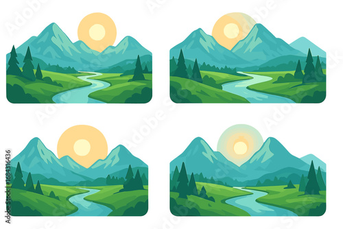 Serene mountain landscape vector illustration with varied river paths and glowing sun at different perspectives, lush green fields, pine trees, and peaceful nature scene