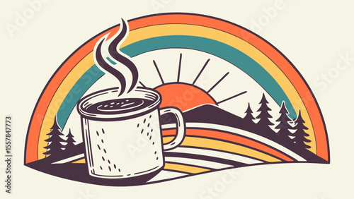 Cozy morning coffee in nature with rainbow and mountain view vintage illustration