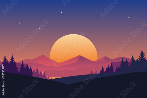 Beautiful vector landscape with sunrise. Early morning in nature with mountains, forest, sun and orange sky. Scenic view background. Flat cartoon illustration for travel.