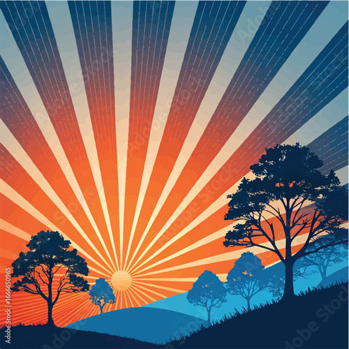 Retro Sunrise Landscape with Trees and Sunburst Rays Illustration