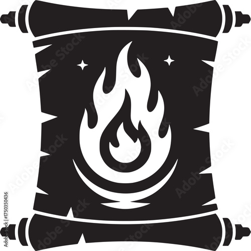 Unleash powerful magic with this captivating scroll icon featuring a blazing flame and sparkling stars