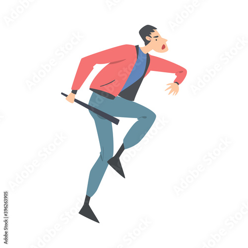 Cartoon Businessman with Charger Confronting Angry Battery Character on Blue Background Illustration
