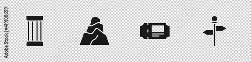 Set Ancient column, Rock stones, Museum ticket and Road traffic signpost icon. Vector.